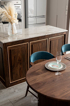 設計概念 當我們接到這個40幾年的老朋友先開始對這個空間做深入研究。先前的時代疲憊經由我們徹底整除改建後,優先把基礎工程都整備好後,再來規劃設計;此空間採用法式摩登設定為主軸,室內設計以白色、胡桃木色及奶茶色為主要立面色彩,並搭配比例精緻的木作收邊、豐富拼花的地磚及素雅地的石材為主體牆。感覺更為自然、休閒的空間氛圍,屋主常處於高壓的工作環境,期許回到家後讓人放鬆,整體色彩是柔和地加上少許跳色,也反映出法式的基礎素材,實木材料、亞麻編織品、重點空間的奢華燈具及紅銅色中島邊框等元素。
