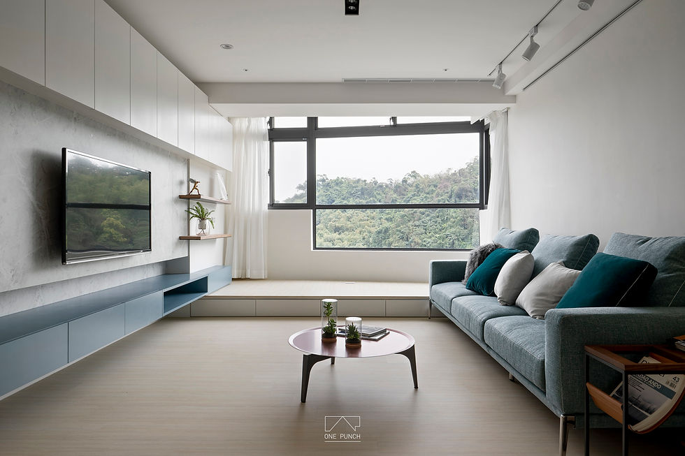 設計概念 家,是孩子最安心的秘密基地。空間裝填著隨時間不停向前流動的生活,業主的三個孩子逐漸從學業生活跨步到社會人士,父母辛苦了大半輩子,遷移到景色清幽的地點,由這邊開始這個家庭的下一步。配色上使用低彩度的色調混搭木頭實木貼皮,家具部分以紅銅茶几、孔雀藍沙發,為清朗的室內氛圍注入活力,室外的景色茂林深篁,也擴大了採光分割面,使家裡的每一面都能感受到大自然的美景。