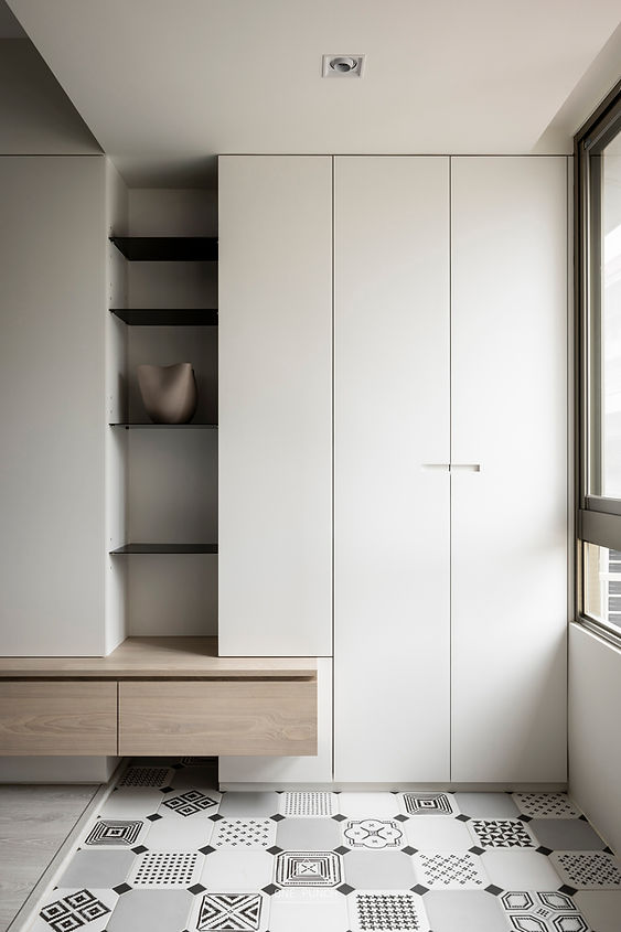 整體色系以白色櫃體與隱藏式收納貫穿,減少木皮比例,並運用垂直線條、無把手設計達成「可視為潔、可用為豐」的雙重需求。六角磚鋪陳玄關與窗邊地坪,不僅建立出場域節奏,也讓回家與啟程之間,有一處輕盈轉場。家具選擇則偏向輕量與低彩度,如無形地與空間對話,不搶眼、不喧囂,卻深深貼合居者生活的軌跡。